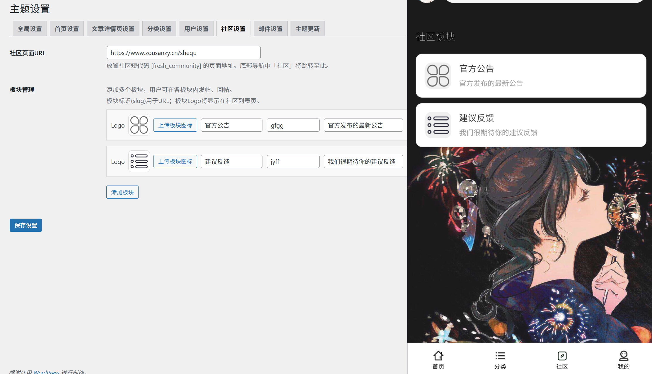 创建好页面后复制页面连接保存到社区URL输入框,然后设置你的板块信息。