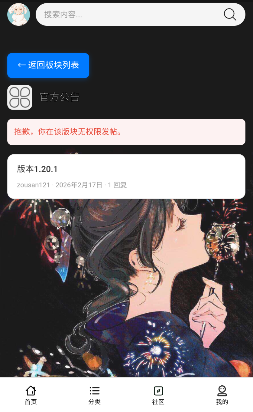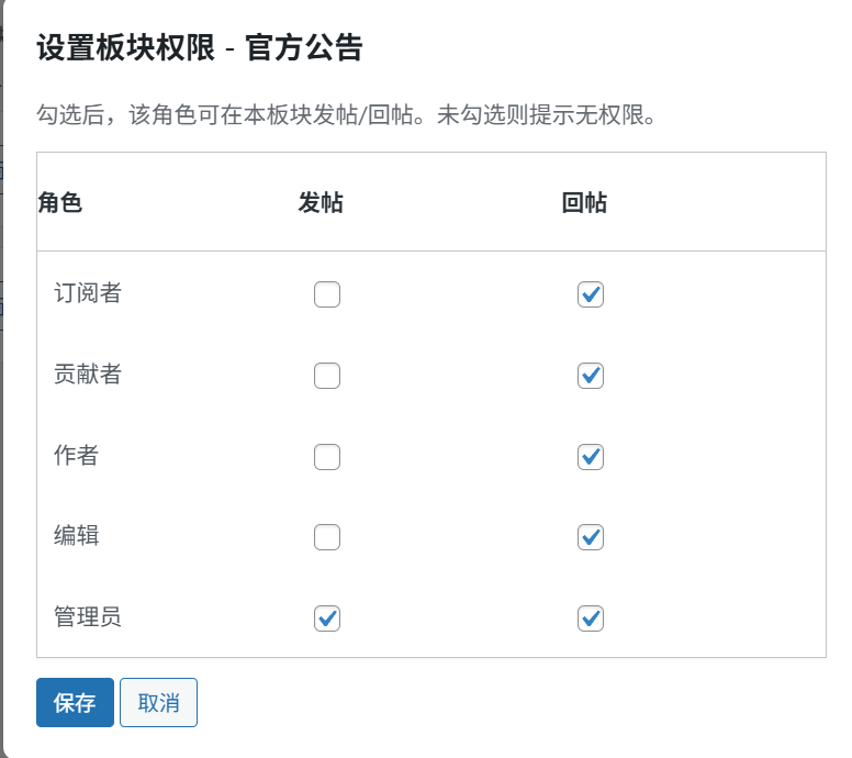 比如我们设置官方公告板块用户只能回帖无法发帖就这样设置,看到的效果如图。