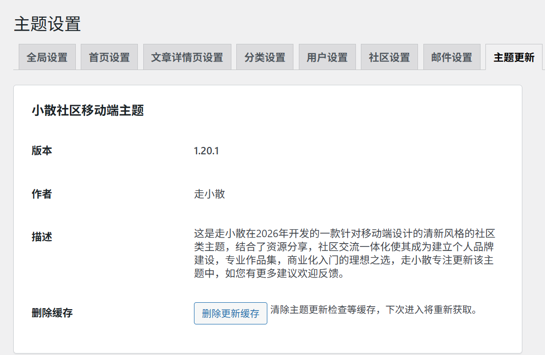 这里显示当前主题版本以及删除缓存功能,当存在最新版本需要更新的时候你可以删除本地缓存然后重新上传最新版主进行更新